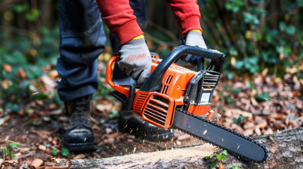 Detailed view of a lumberjack using a chainsaw to cut a log with professional precision and rugged safety gloves.