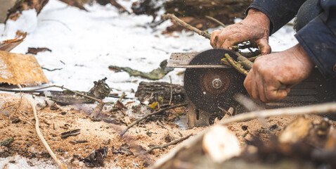 Man cutting wood using stationary circular saw outdoors in winter for kindling close-up view