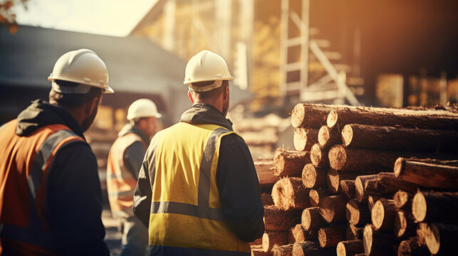 Professional lumberjacks standing by a massive stack of freshly harvested logs in a dense forest
