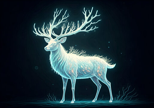 Majestic stag with glowing antlers in enchanted forest
