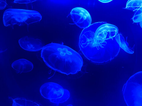 Glowing jellyfish pulse gently in the water, creating a mesmerizing and elegant underwater ballet performance.