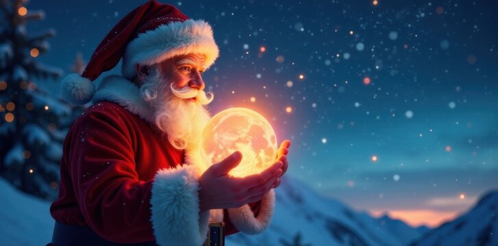 Radiant Santa grasps luminescent orb over blurred blue sky with void , glowing, serene, radiant