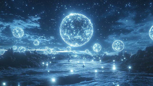 Vast field of shimmering energy orbs suspended in a luminescent cosmic landscape