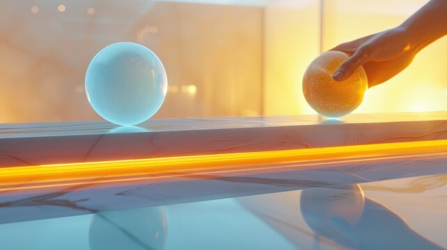 Hand positioning glowing sphere beside neon-lit track with another luminescent orb on reflective surface against an abstract backgroundfuturistic