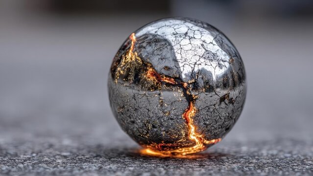 A spherical rock cracked open revealing glowing molten lava seeping through the fiery orange cracks. Concept Molten Lava, Fiery Cracks, Glowing Interior, Spherical Rock, Geological Marvel