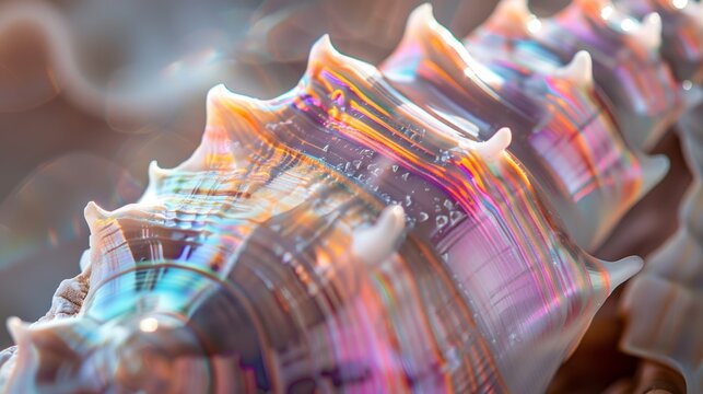A detailed closeup of a luminescent seashell showcasing its vibrant shimmering colors and an almost metallic appearance