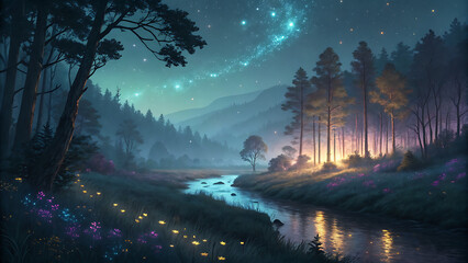 Mystical luminescent dreaming tree radiating magic in night landscape