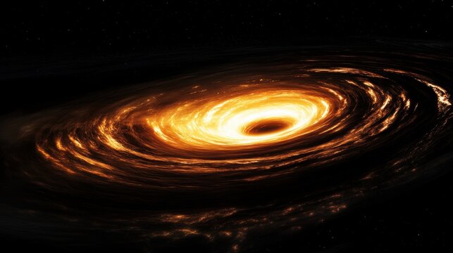 A swirling, luminous accretion disk surrounds a black hole in the vast expanse of space