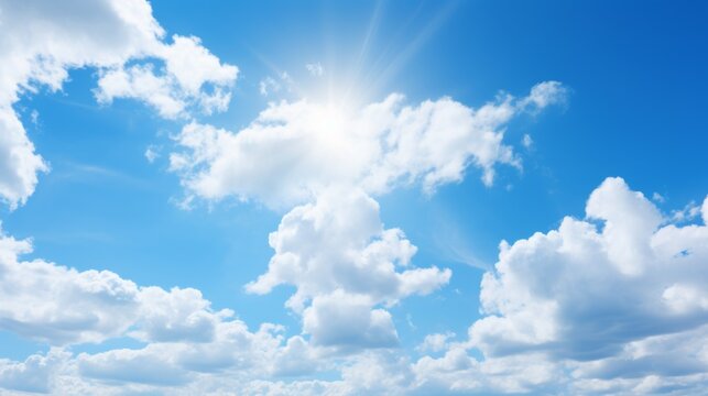 This image features a clear, bright blue sky dotted with fluffy white clouds and a radiant sun shining down, creating a serene and peaceful atmosphere.