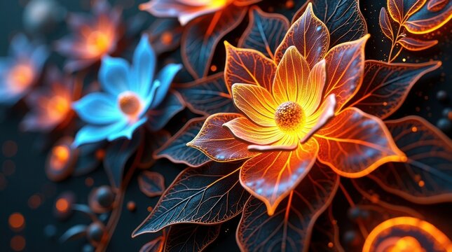 Luminous floral arrangement with glowing petals and dark leaves image