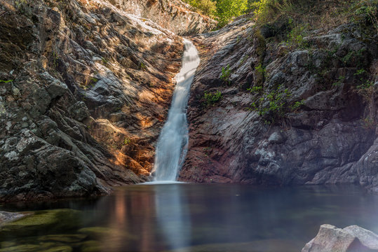 Waterfall during the golden hour with warm soft light illuminating the scene