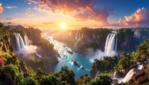 Dramatic aerial of majestic waterfall amid verdant landscape