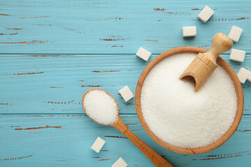 Bowl and scoop with white sand and lump sugar on blue wooden background