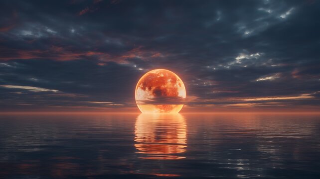 Red Moon Rising. Total Lunar Eclipse over the Oceans, Blood moon reflection on sea waters.