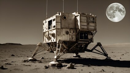 A lunar exploration module with a star-filled sky and a dusty moon surface