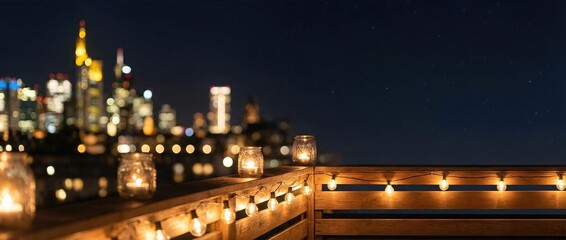 String light garland on wooden balcony railing with glowing city skyline in background at night. Warm outdoor evening atmosphere for celebration. Banner with copy space