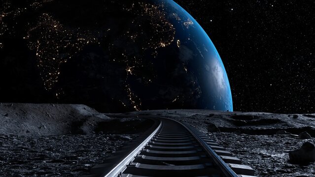 Railway tracks extend across a barren lunar landscape with a detailed view of a brilliantly illuminated Earth planet displaying city lights, set against a vast starry sky. 3d illustration