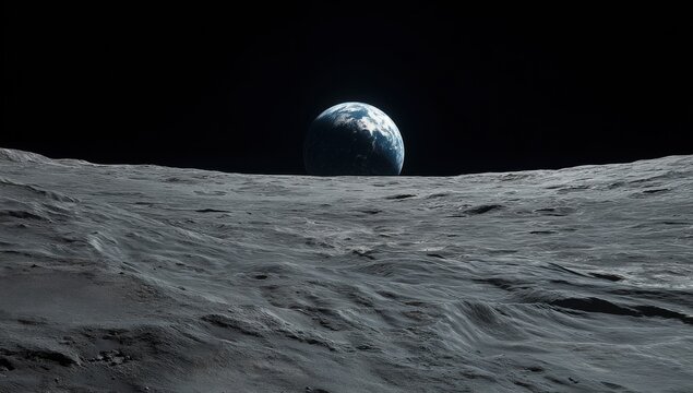 Earth viewed from moon, desolate lunar landscape