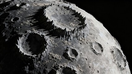 Heavily cratered lunar surface close up displaying deep shadows cast by jagged rims of impact features.
