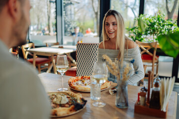 Cheers, celebrating and winning friends drinking wine together at a dinner celebration in a restaurant. Double date of loving and romantic couples dining and having fun on a weekend