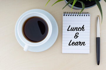 Lunch and Learn concept. Text in a picture frame on a wooden office table