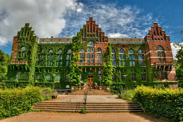 The building of the University Library in Lund, Sweden. The building of architecture overgrown with greenery