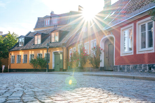 Colorful townhouses bordered with blooming roses in Lund Sweden