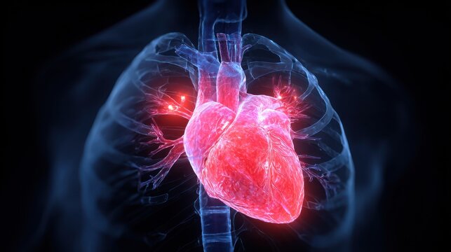 A transparent human body with a glowing heart in the chest area.