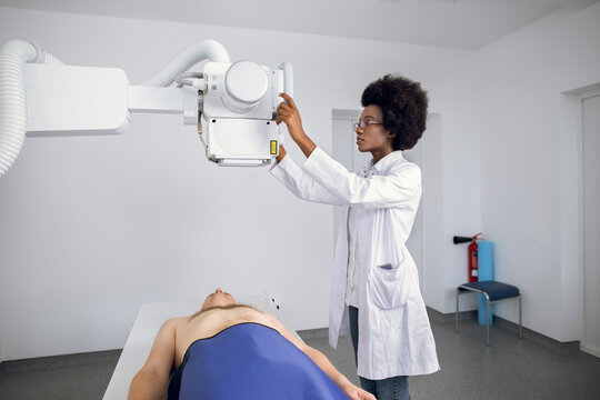 Young confident Afro American female doctor radiologist, taking x-ray scan of young male patient lying on the machine table. Doctor standing near the patient during chest X Ray procedure