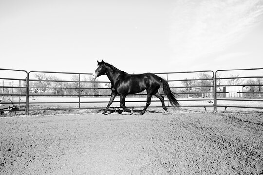 Horse during longeing training in roofed round pen arena. Bay horse running in circle on longe line approaching..