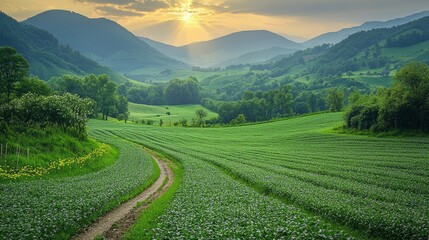 Tranquil rice paddy field with dirt pathway in rural landscape