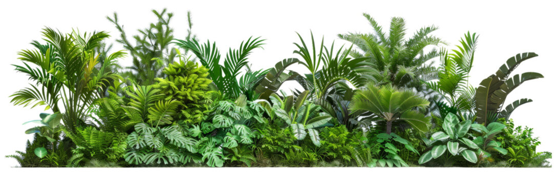 Dense arrangement of lush green tropical plants featuring an array of leaves isolated against a white background