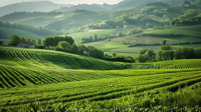 Vibrant agriculture landscape in lush green countryside with rolling hills and flourishing farmland