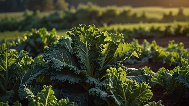 Organic Lush green kale field growing in the early morning sunlight. Vibrant Green Fields of Leafy Vegetables at Sunrise