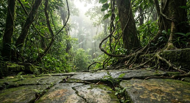 jungle rainforest Misty scene A misty rainforest scene with thick fog rolling through the trees, creating a mysterious and serene atmosphere.