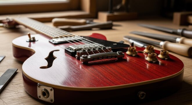 Cherry red hollow-body guitar on a wooden bench with tools in background