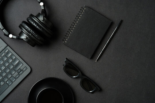 Top view of dark trendy workplace with laptop computer and office supplies on black leather desk
