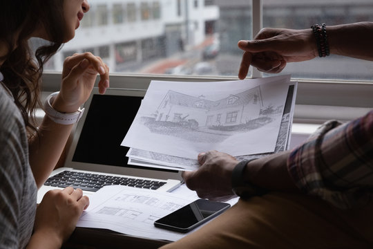 Business people discussing over blueprint in office at desk