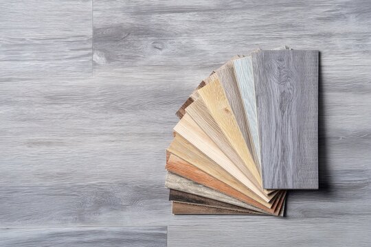 Sample catalog of luxury vinyl laminate floor tiles with a new interior design for a house or floor on a light wooden background