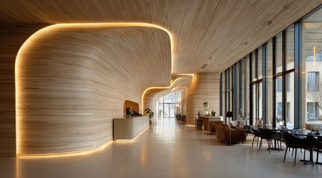 Modern lobby with curved wooden walls, ambient lighting, and floor-to-ceiling windows