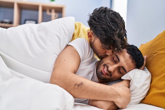 Young couple two family man woman she he wear t-shirt pajama lying in bed cover face mouth with blanket look to each other spend time together in bedroom home in own room hotel. Real estate concept.