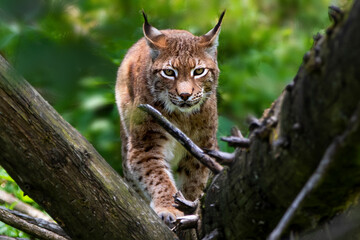 Lynx in green forest. Wildlife scene from nature. Walking Eurasian lynx, animal behaviour in habitat. Wild cat from Germany. Wild Bobcat between the trees. Hunting carnivore in autumn grass.