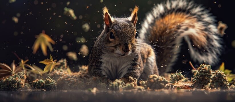 A carnivore like a lynx or feline cat with whiskers and fur, sitting on a pile of leaves, eyeing a fawn in the grass at a closeup event