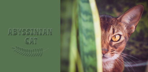 Abyssinian cat close up, in natural conditions in the greenery, like a predator, Looking at camera,  with an inscription