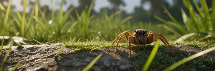Brown and yellow striped spiders rest atop a blade of grass, lynx spider, natural world