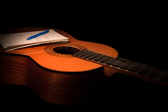 Acoustic guitar and note pad close up on black background. A studio shot with warm lighting, isolated. This image is ideal for songwriting concepts, lessons, music courses and teaching.