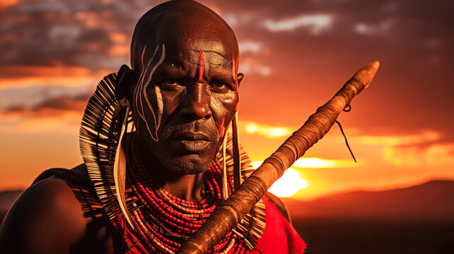 Portrait of a Maasai warrior from Kenya, adorned in vibrant traditional attire and poised with a spear on sunset