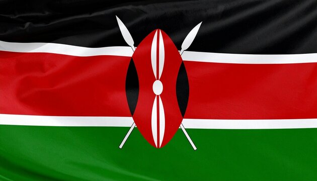 Photorealistic flag of Kenya with black, red, and green stripes, a traditional Maasai shield and spears in the center. Fabric texture with folds, isolated on white background.