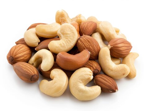 A small pile of creamy-white macadamia nuts, some halved, sits on a stark white background