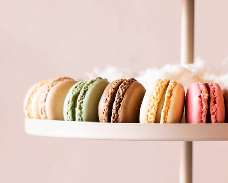 An assortment of colorful macarons arranged on a delicate plate with a soft pastel background